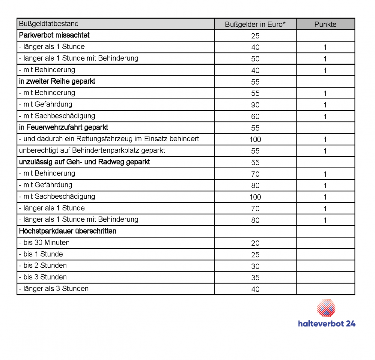 Die Bußgelder bewegen sich oft zwischen 55 und 110 Euro. Wo Fahrzeuge abgeschleppt werden, kommen weitere Kosten hinzu. Das Abschleppen kann sehr teuer werden. Außerdem müssen Sie damit rechnen, Punkte in Flensburg zu bekommen.